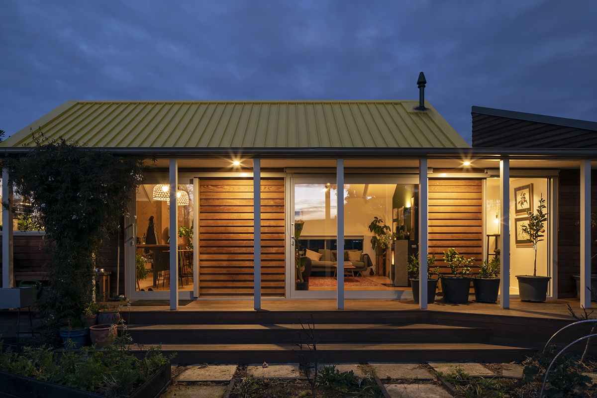 On a suburban street at the foot of Christchurch’s port hills, a sunny yellow roof is just visible behind a high fence and established trees. Jen and Keeley Pomeroy bought the cottage as their first home, and knew they wanted to stay in this location, but as their young family grew, more space was needed.