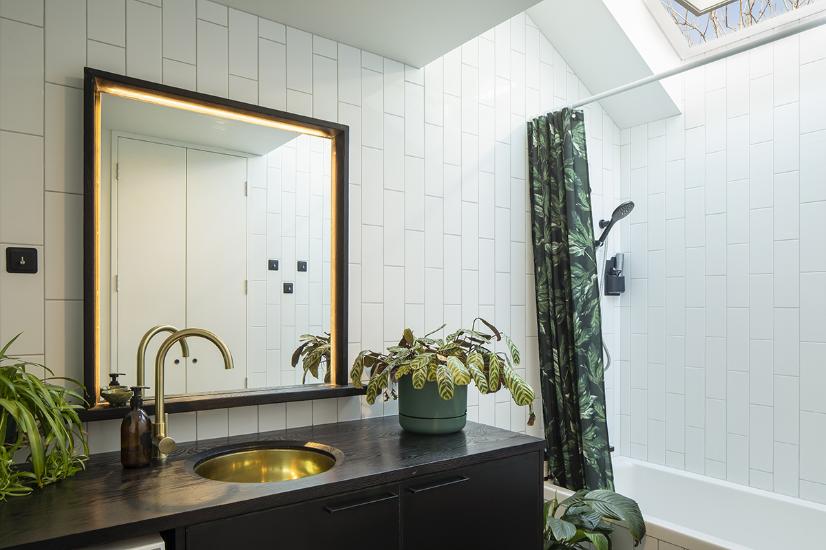 Hard working, practical materials are used throughout the 106m2 house. The bathroom features a charred ash vanity and a soft rubber floor that feels great underfoot. An operable skylight at the ceiling’s highest point allows light to flood in and moisture to escape, maintaining a healthy and dry environment.